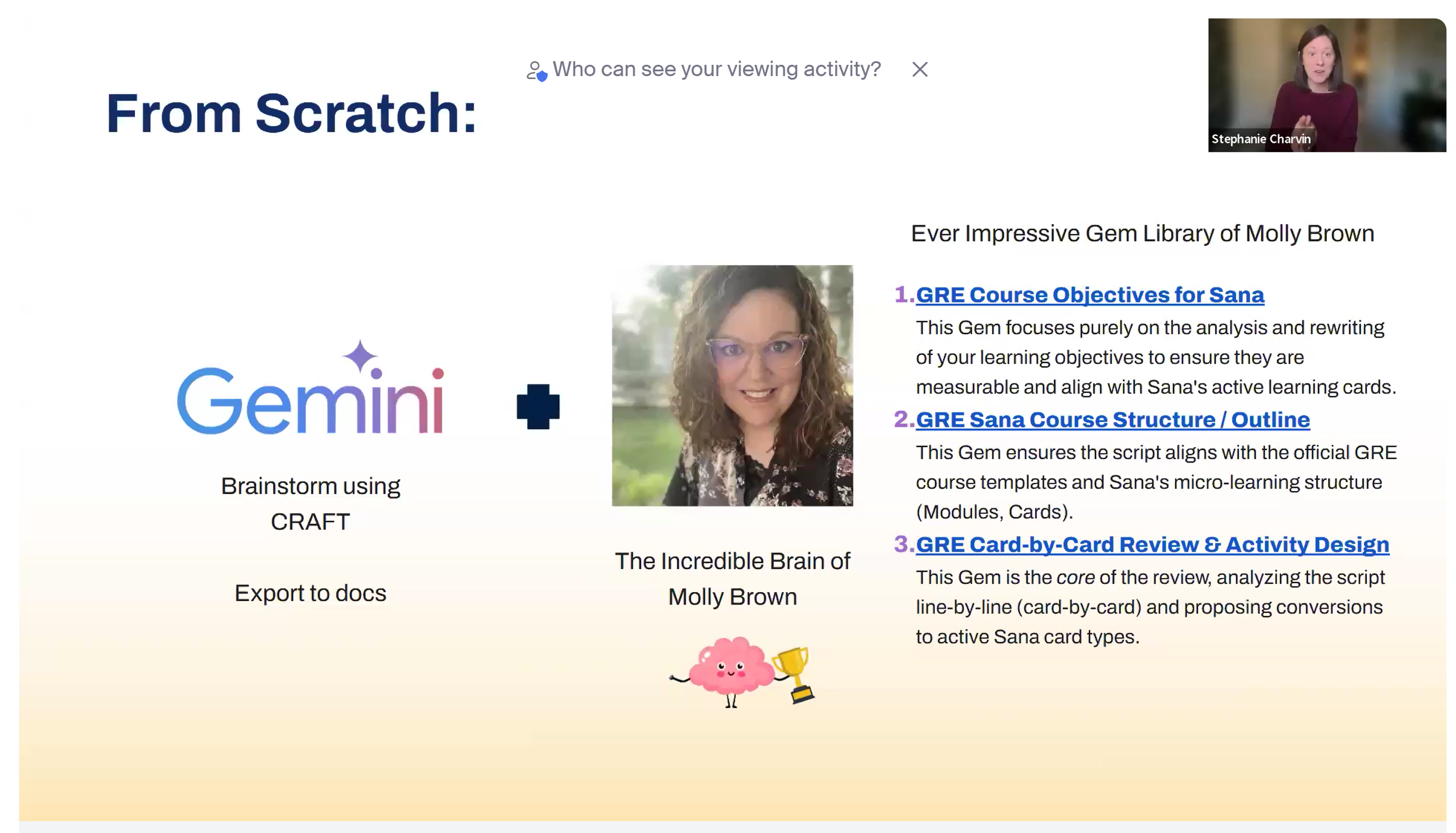 Built a Gem to suggest activities aligned to learning objectives, tailored to the training modality (ILT, VILT, or eLearning).