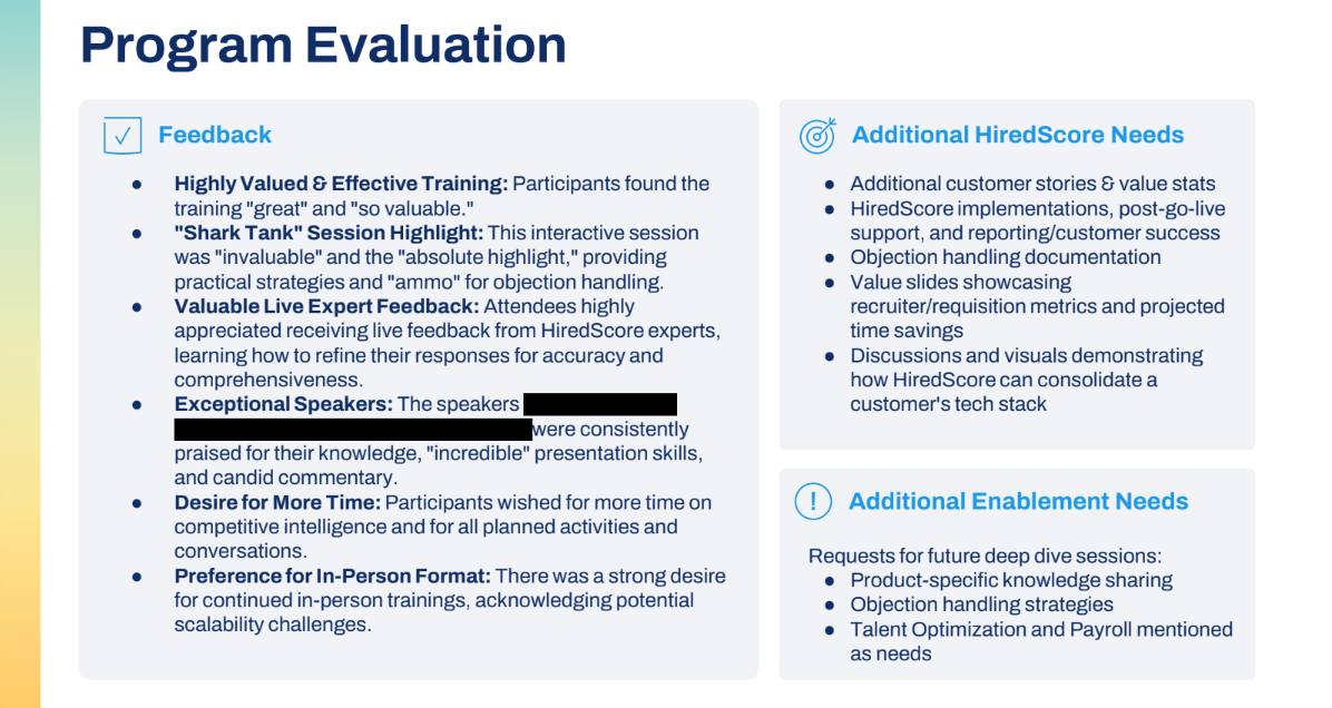 This two-day, in-person workshop equipped Solution Consultants to “dive deeper” into HiredScore. While many participants already possessed general product knowledge, only a few felt confident addressing the most challenging customer pain points or strategically positioning HiredScore against competitors while responding accurately to questions and objections. To bridge that gap, I designed a highly interactive learning experience featuring real-world scenario activities. These exercises provided a safe, supportive environment for Solution Consultants to practice, refine their skills, and build confidence in high-stakes customer interactions.