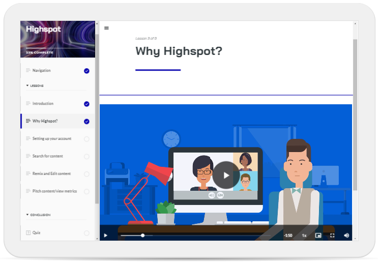 This eLearning was designed to introduce Highspot to Zeta’s Sales Representatives. It includes an animated Vyond video that depicts an under-performing sales rep who does not use Highspot vs. a highly successful sales rep who uses Highspot appropriately.